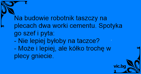Na budowie robotnik taszczy na plecach dwa worki cementu. Spotyka go szef i pyta: