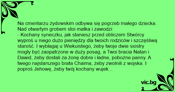 - Kochany syneczku, jak staniesz przed obliczem Stwórcy wyproś u niego dużo pieniędzy dla twoich rodziców i szczęśliwą starość. I wybłagaj u Wiekuistego, żeby twoje dwie siostry mogły być zaopatrzone w duży posag, a Twoi bracia Natan i Dawid, żeby dostali za żonę dobre i ładne, pobożne panny. A twego najstarszego brata Chaima, żeby zwolnili z wojska. I poproś Jehowę, żeby twój kochany wujek Abram wreszcie wyzdrowiał...