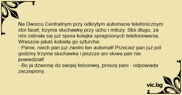 - Panie, niech pan już zwolni ten automat! Przecież pan już pól godziny trzyma słuchawkę i jeszcze ani słowa pan nie powiedział!