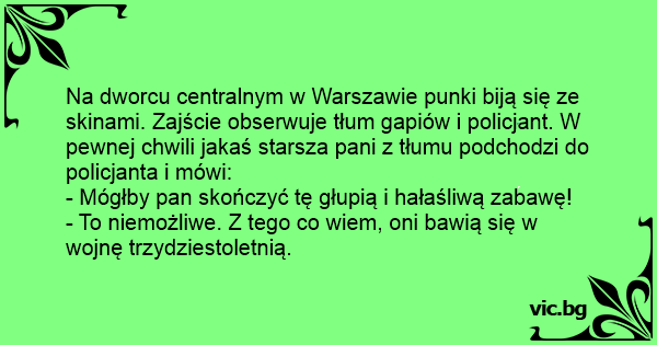 Na dworcu centralnym w Warszawie punki biją się ze skinami. Zajście obserwuje tłum gapiów i policjant. W pewnej chwili jakaś starsza pani z tłumu podchodzi do policjanta i mówi: