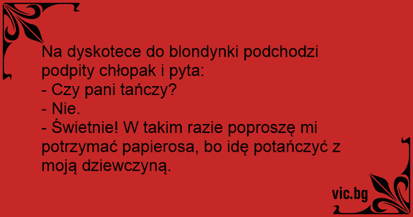 - Świetnie! W takim razie poproszę mi potrzymać papierosa, bo idę potańczyć z moją dziewczyną.