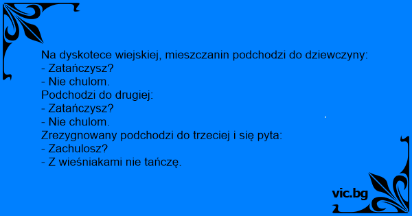 Na dyskotece wiejskiej, mieszczanin podchodzi do dziewczyny: