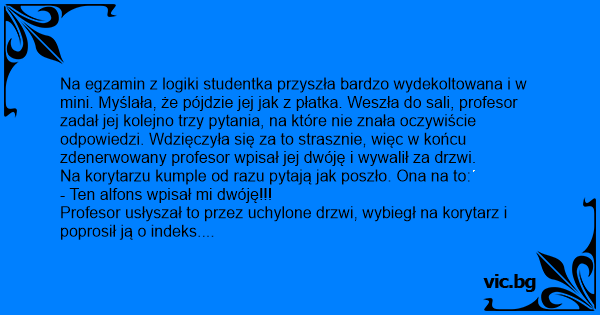 Na egzamin z logiki studentka przyszła bardzo wydekoltowana i w mini. Myślała, że pójdzie jej jak z płatka. Weszła do sali, profesor zadał jej kolejno trzy pytania, na które nie znała oczywiście odpowiedzi. Wdzięczyła się za to strasznie, więc w końcu zdenerwowany profesor wpisał jej dwóję i wywalił za drzwi.