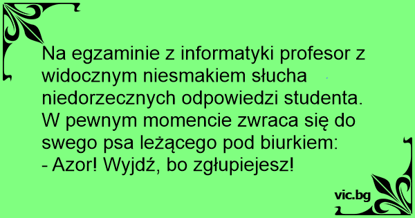 Na egzaminie z informatyki profesor z widocznym niesmakiem słucha niedorzecznych odpowiedzi studenta. W pewnym momencie zwraca się do swego psa leżącego pod biurkiem: