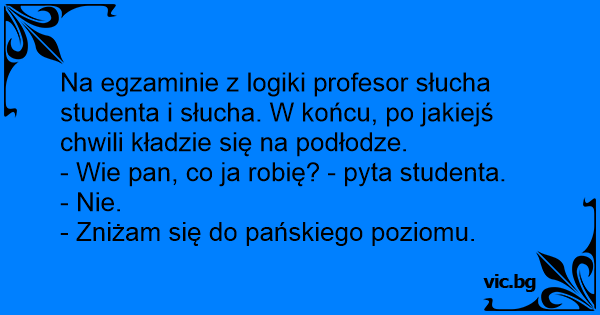 Na egzaminie z logiki profesor słucha studenta i słucha. W końcu, po jakiejś chwili kładzie się na podłodze.