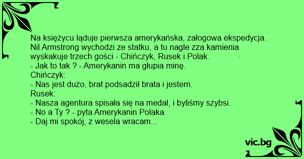 Na księżycu ląduje pierwsza amerykańska, załogowa ekspedycja. Nil Armstrong wychodzi ze statku, a tu nagle zza kamienia wyskakuje trzech gości - Chińczyk, Rusek i Polak.