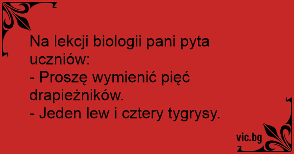 Pani od biologii pyta Jasia: - Jasiu wymień mi 5 zwierząt mieszkających w Afryce. Na to Jaś: - 2 małpy i 3 słonie.