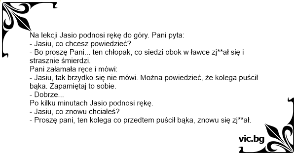- Bo proszę Pani... ten chłopak, co siedzi obok w ławce zj**ał się i strasznie śmierdzi.