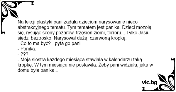Na lekcji plastyki pani zadała dzieciom narysowanie nieco abstrakcyjnego tematu. Tym tematem jest panika. Dzieci mozolą się, rysując sceny pożarów, trzęsień ziemi, terroru... Tylko Jasiu siedzi beztrosko. Narysował dużą, czerwoną kropkę.