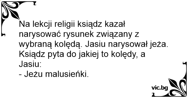Na lekcji religii ksiądz kazał narysować rysunek związany z wybraną kolędą. Jasiu narysował jeża. Ksiądz pyta do jakiej to kolędy, a Jasiu: