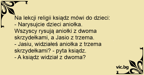 - Jasiu, widziałeś aniołka z trzema skrzydełkami? - pyta ksiądz.