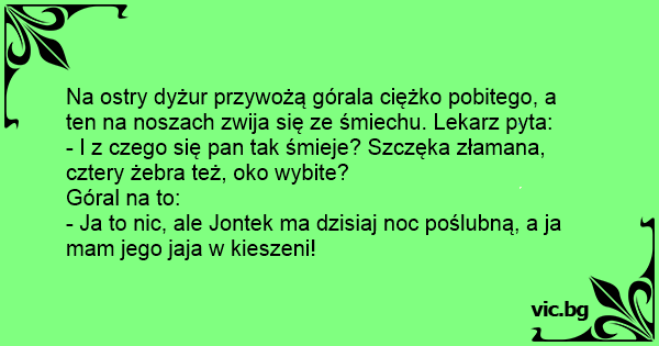 Na ostry dyżur przywożą górala ciężko pobitego, a ten na noszach zwija się ze śmiechu. Lekarz pyta: