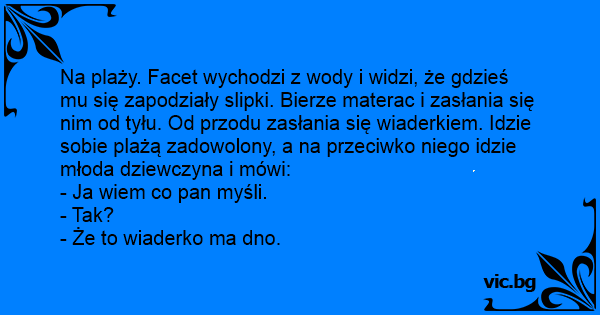 Na plaży. Facet wychodzi z wody i widzi, że gdzieś mu się zapodziały slipki. Bierze materac i zasłania się nim od tyłu. Od przodu zasłania się wiaderkiem. Idzie sobie plażą zadowolony, a na przeciwko niego idzie młoda dziewczyna i mówi: