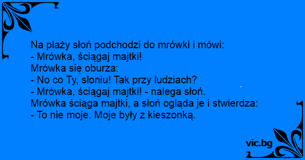 Na plaży słoń podchodzi do mrówki i mówi: