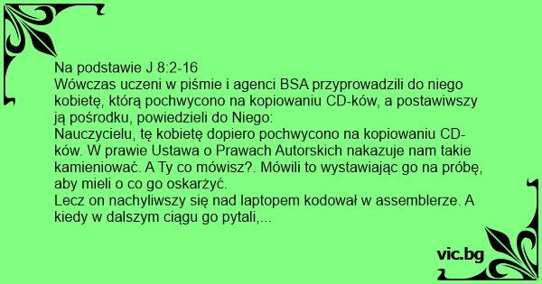 Lecz on nachyliwszy się nаd laptopem kodował w assemblerze. A kiedy w dalszym ciągu go pytali, podniósł się i rzekł do nich: Kto z was nie miał nigdy pirackiej kopii, niech pierwszy rzuci na nią kamień. I powtórnie nachyliwszy się kodował w assemblerze. Kiedy to usłyszeli, wszyscy jeden po drugim zaczęli odchodzić, poczynając od starszych, aż do ostatnich. Pozostał tylko on i kobieta, stojąca na środku.