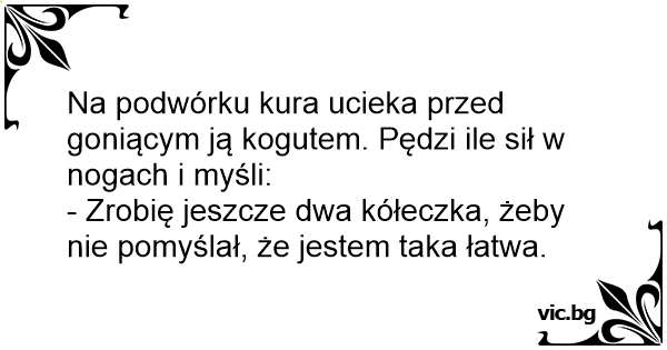 Na podwórku kura ucieka przed goniącym ją kogutem. Pędzi ile sił w nogach i myśli: