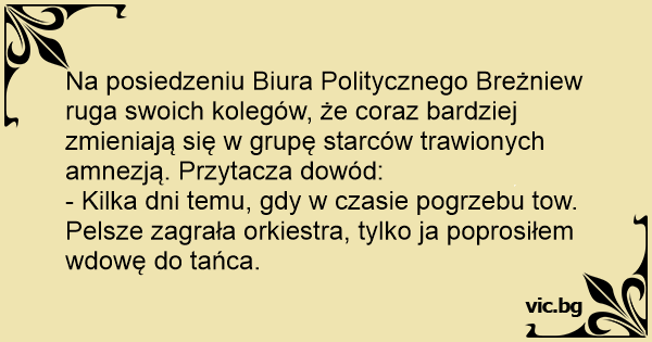 Na posiedzeniu Biura Politycznego Breżniew ruga swoich kolegów, że coraz bardziej zmieniają się w grupę starców trawionych amnezją. Przytacza dowód: