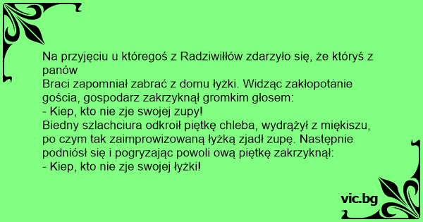 Braci zapomniał zabrać z domu łyżki. Widząc zakłopotanie gościa, gospodarz zakrzyknął gromkim głosem: