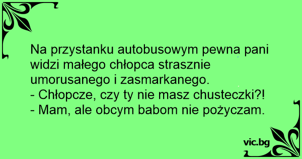 Na przystanku autobusowym pewna pani widzi małego chłopca strasznie umorusanego i zasmarkanego.