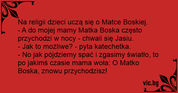 - No jak pójdziemy spać i zgasimy światło, to po jakimś czasie mama woła: O Matko Boska, znowu przychodzisz!