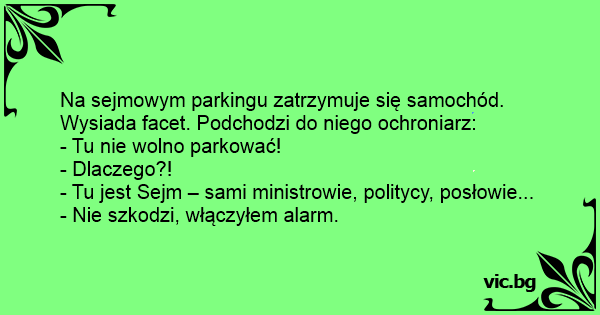 Un hombre aparca su coche frente al Congreso de diputados. En eso se acerca un trabajador de seguridad y le dice: -Señor, por favor, le pediría que quite de inmediato su coche de aquí. -¿Por qué? ¿Qué sucede? -Pasa que los diputados están a punto de salir -Ah no se preocupe, ya tengo alarma...