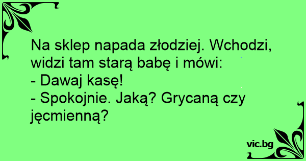 Na sklep napada złodziej. Wchodzi, widzi tam starą babę i mówi: