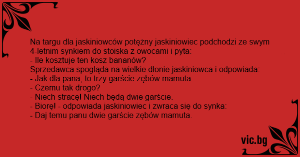 Na targu dla jaskiniowców potężny jaskiniowiec podchodzi ze swym 4-letnim synkiem do stoiska z owocami i pyta: