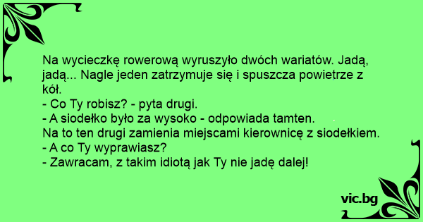 Na wycieczkę rowerową wyruszyło dwóch wariatów. Jadą, jadą... Nagle jeden zatrzymuje się i spuszcza powietrze z kół.