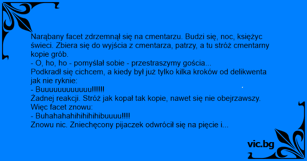 Narąbany facet zdrzemnął się na cmentarzu. Budzi się, noc, księżyc świeci. Zbiera się do wyjścia z cmentarza, patrzy, a tu stróż cmentarny kopie grób.