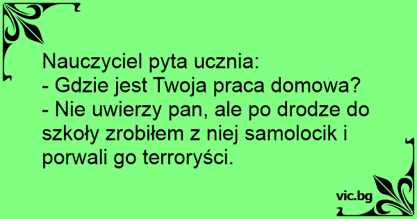 - Nie uwierzy pan, ale po drodze do szkoły zrobiłem z niej samolocik i porwali go terroryści.