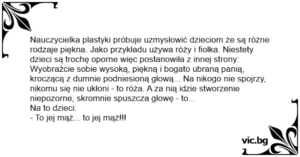Nauczycielka plastyki próbuje uzmysłowić dzieciom że są różne rodzaje piękna. Jako przykładu używa róży i fiołka. Niestety dzieci są trochę oporne więc postanowiła z innej strony: