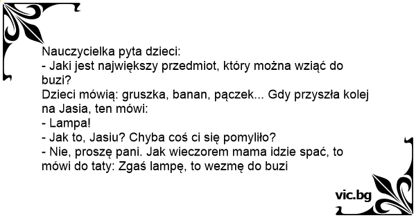 - Nie, proszę pani. Jak wieczorem mama idzie spać, to mówi do taty: Zgaś lampę, to wezmę do buzi