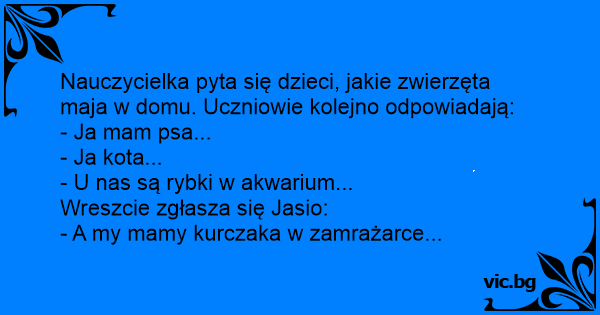 Nauczycielka pyta się dzieci, jakie zwierzęta maja w domu. Uczniowie kolejno odpowiadają: