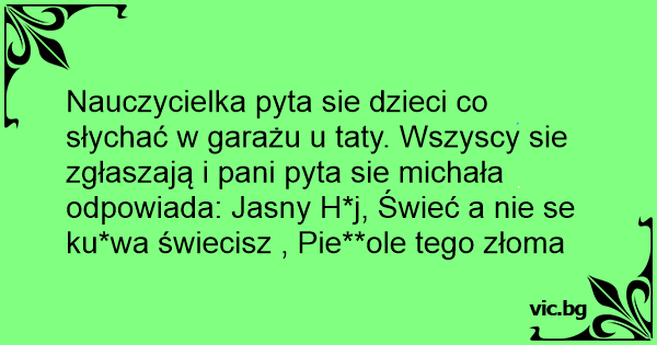 Nauczycielka pyta sie dzieci co słychać w garażu u taty. Wszyscy sie zgłaszają i pani pyta sie michała odpowiada: Jasny H*j, Świeć a nie se ku*wa świecisz , Pie**ole tego złoma