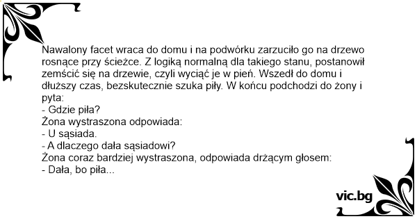 Nawalony facet wraca do domu i na podwórku zarzuciło go na drzewo rosnące przy ścieżce. Z logiką normalną dla takiego stanu, postanowił zemścić się na drzewie, czyli wyciąć je w pień. Wszedł do domu i dłuższy czas, bezskutecznie szuka piły. W końcu podchodzi do żony i pyta: