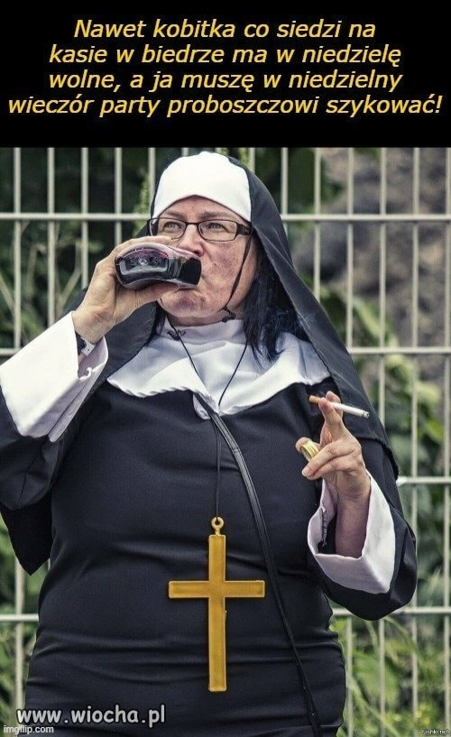 Nawet kobitka co siedzi na kasie w biedrze ma w niedziele wolne, a ja musze w niedzielny wieczór party proboszczowi szykowac!