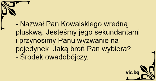 - Nazwał Pan Kowalskiego wredną pluskwą. Jesteśmy jego sekundantami i przynosimy Panu wyzwanie na pojedynek. Jaką broń Pan wybiera?