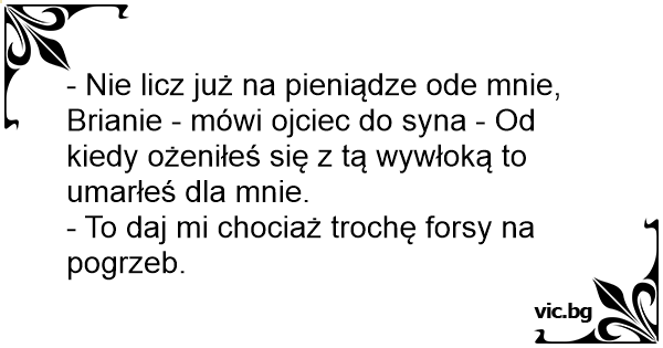 - Nie licz już na pieniądze ode mnie, Brianie - mówi ojciec do syna - Od kiedy ożeniłeś się z tą wywłoką to umarłeś dla mnie.