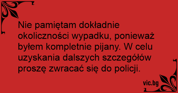Nie pamiętam dokładnie okoliczności wypadku, ponieważ byłem kompletnie pijany. W celu uzyskania dalszych szczegółów proszę zwracać się do policji.