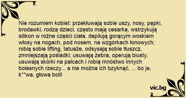 Nie rozumiem kobiet: przekłuwają sobie uszy, nosy, pępki, brodawki, rodzą dzieci, często mają cesarkę, wstrzykują silikon w różne części ciała, depilują gorącym woskiem włosy na nogach, pod nosem, na wzgórkach łonowych; robią sobie lifting, tatuaże, odsysają sobie tłuszcz, zmniejszają pośladki; usuwają żebra, operują biusty, usuwają skórki na palcach i robią mnóstwo innych bolesnych rzeczy... a nie można ich bzyknąć, ... bo je, k**wa, głowa boli!
