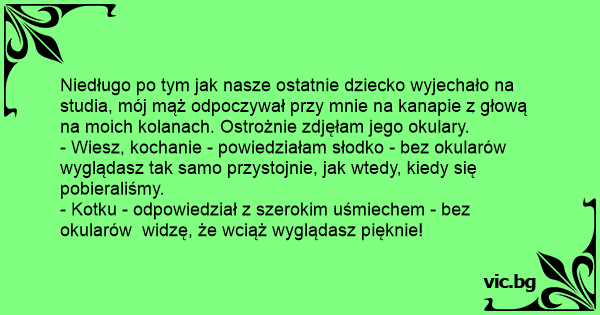 - Wiesz, kochanie - powiedziałam słodko - bez okularów wyglądasz tak samo przystojnie, jak wtedy, kiedy się pobieraliśmy.