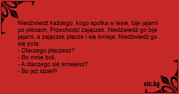 Niedźwiedź każdego, kogo spotka w lesie, bije jajami po plecach. Przechodzi zajączek. Niedźwiedź go bije jajami, a zajączek płacze i się śmieje. Niedźwiedź go się pyta: