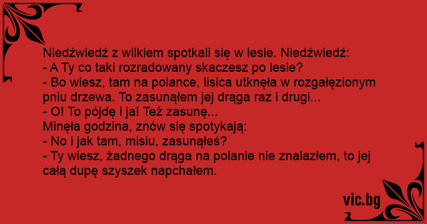 - Ty wiesz, żadnego drąga na polanie nie znalazłem, to jej całą dupę szyszek napchałem.