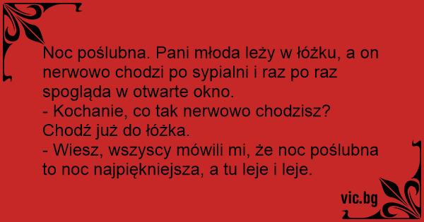 - Wiesz, wszyscy mówili mi, że noc poślubna to noc najpiękniejsza, a tu leje i leje.