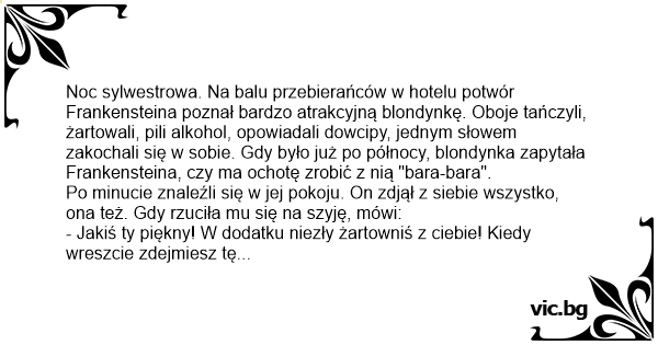 Noc sylwestrowa. Na balu przebierańców w hotelu potwór Frankensteina poznał bardzo atrakcyjną blondynkę. Oboje tańczyli, żartowali, pili alkohol, opowiadali dowcipy, jednym słowem zakochali się w sobie. Gdy było już po północy, blondynka zapytała Frankensteina, czy ma ochotę zrobić z nią "bara-bara".