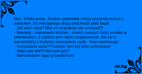 Noc. Wielki pożar. Siedem jednostek straży pożarnej walczy z żywiołem. Do kierującego akcją podchodzi jakiś facet: