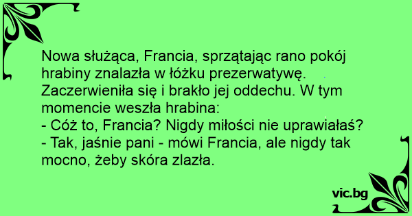 Nowa służąca, Francia, sprzątając rano pokój hrabiny znalazła w łóżku prezerwatywę. Zaczerwieniła się i brakło jej oddechu. W tym momencie weszła hrabina: