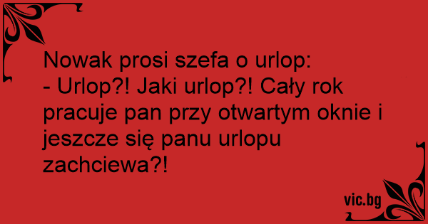 - Urlop?! Jaki urlop?! Cały rok pracuje pan przy otwartym oknie i jeszcze się panu urlopu zachciewa?!