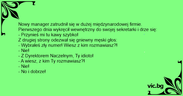 Nowy manager zatrudnił się w dużej międzynarodowej firmie. Pierwszego dnia wykręcił wewnętrzny do swojej sekretarki i drze się: - Przynieś mi tu kawy szybko! Z drugiej strony odezwał się gniewny męski głos: - Wybrałeś zły numer! Wiesz z kim rozmawiasz?! - Nie! - Z Dyrektorem Naczelnym, Ty idioto! - A wiesz, z kim Ty rozmawiasz?! - Nie! - No i dobrze!