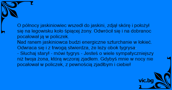 - Słuchaj stary! - mówi tygrys - Jesteś o wiele sympatyczniejszy niż twoja żona, którą wczoraj zjadłem. Gdybyś mnie w nocy nie pocałował w policzek, z pewnością zjadłbym i ciebie!